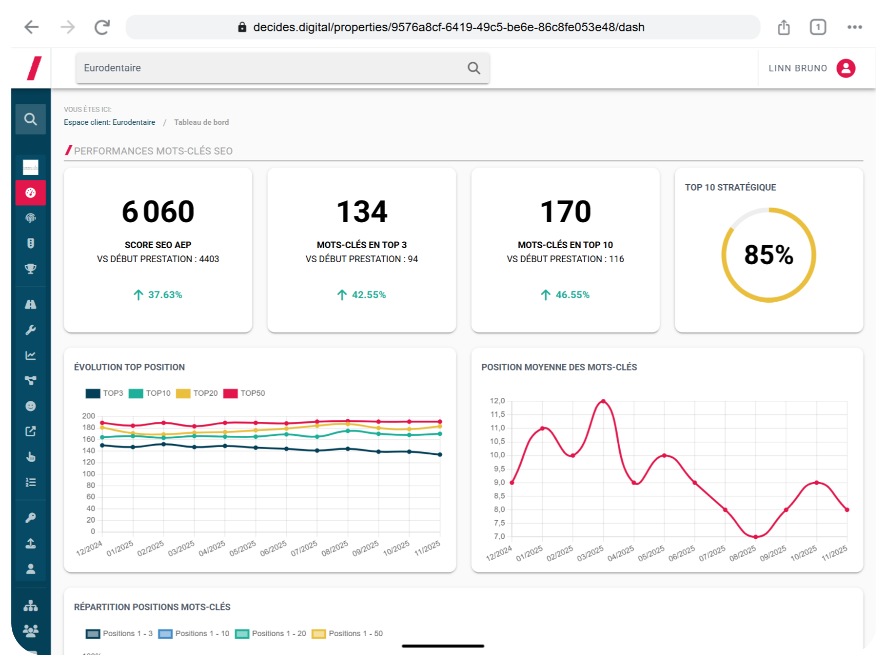 Decides offre un tableau de bord complet pour surveiller les indicateurs essentiels de votre visibilité SEO.
