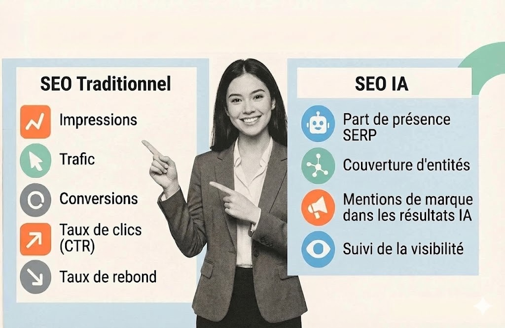 La mesure de la performance change aussi : au-delà des positions classiques, il faut suivre dans combien de fonctionnalités de la SERP une marque apparaît pour ses mots-clés à forte valeur (AI Overview, PAA, vidéos, forums, shopping) et viser une présence simultanée sur 3 ou 4 surfaces par sujet prioritaire. En 2026, ne pas être “citable” et “réutilisable” par les IA, c’est accepter de devenir invisible, même avec de bons rankings traditionnels.