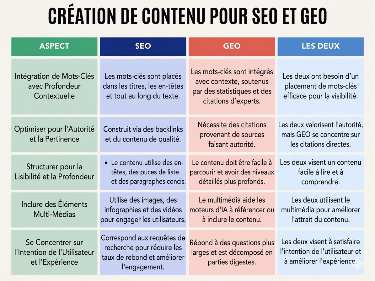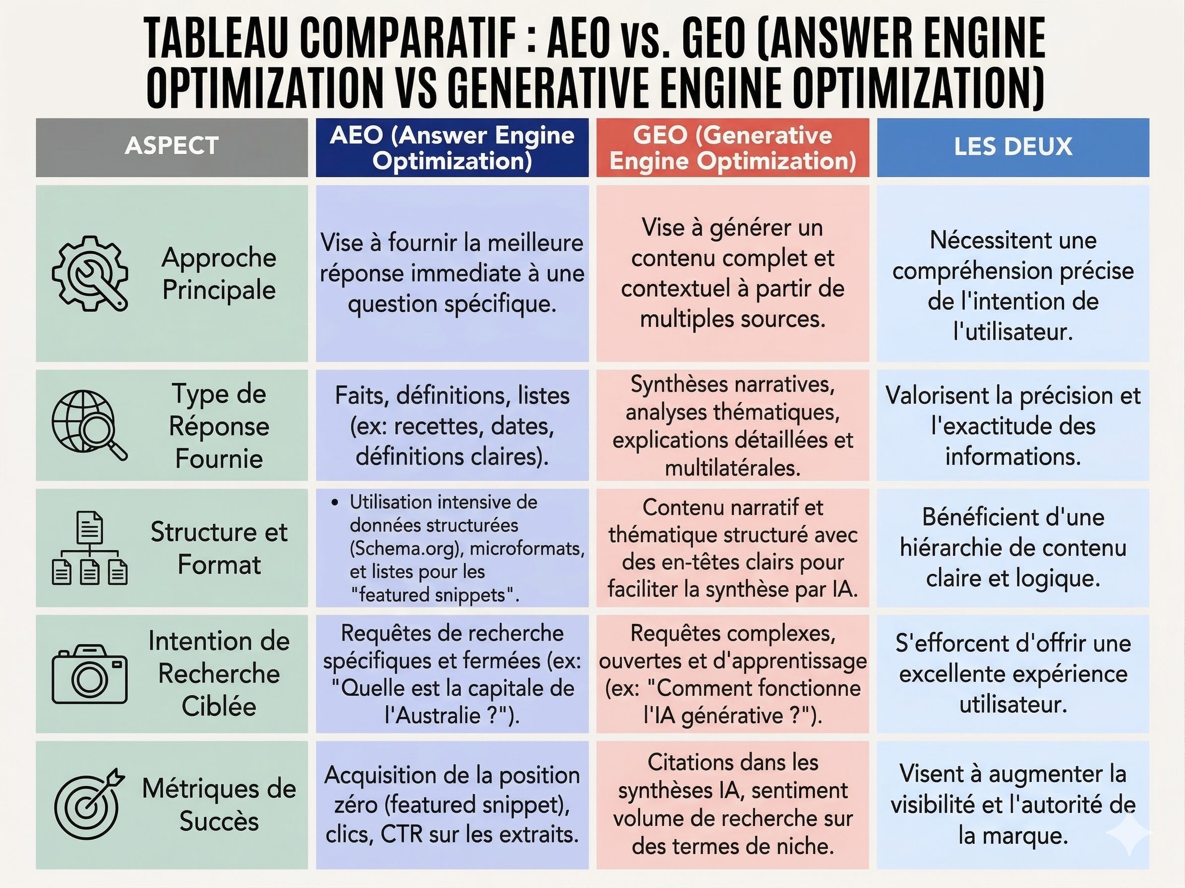 AEO et GEO sont proches, mais ne recouvrent pas exactement la même ambition : l’une cherche à devenir la réponse, l’autre à être utilisé dans la réponse.
