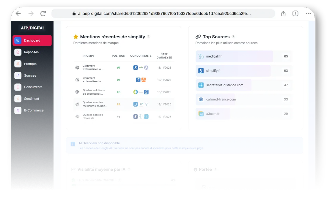 Evaluez votre visibilité sur Google overviews, ChatGPT et Perplexity en 1 seul clic avec notre outil interne dédié à nos clients.